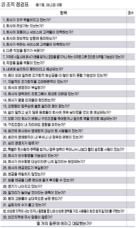 8~15‘예’라고 답한 항목이 일반적인 문제인지 회사의 문제인지 확인한다. 예라고 답한 항목이 주로 회사에 관련된 문제라면 옮기는 것을 고려한다, 모든 항목에 좋은 점수를 줄 수 있는 회사는 없다는 점을 기억하면서, 결정을 내리기 전에 자신의 답을 다시 한 번 신중하게 검토하자.
