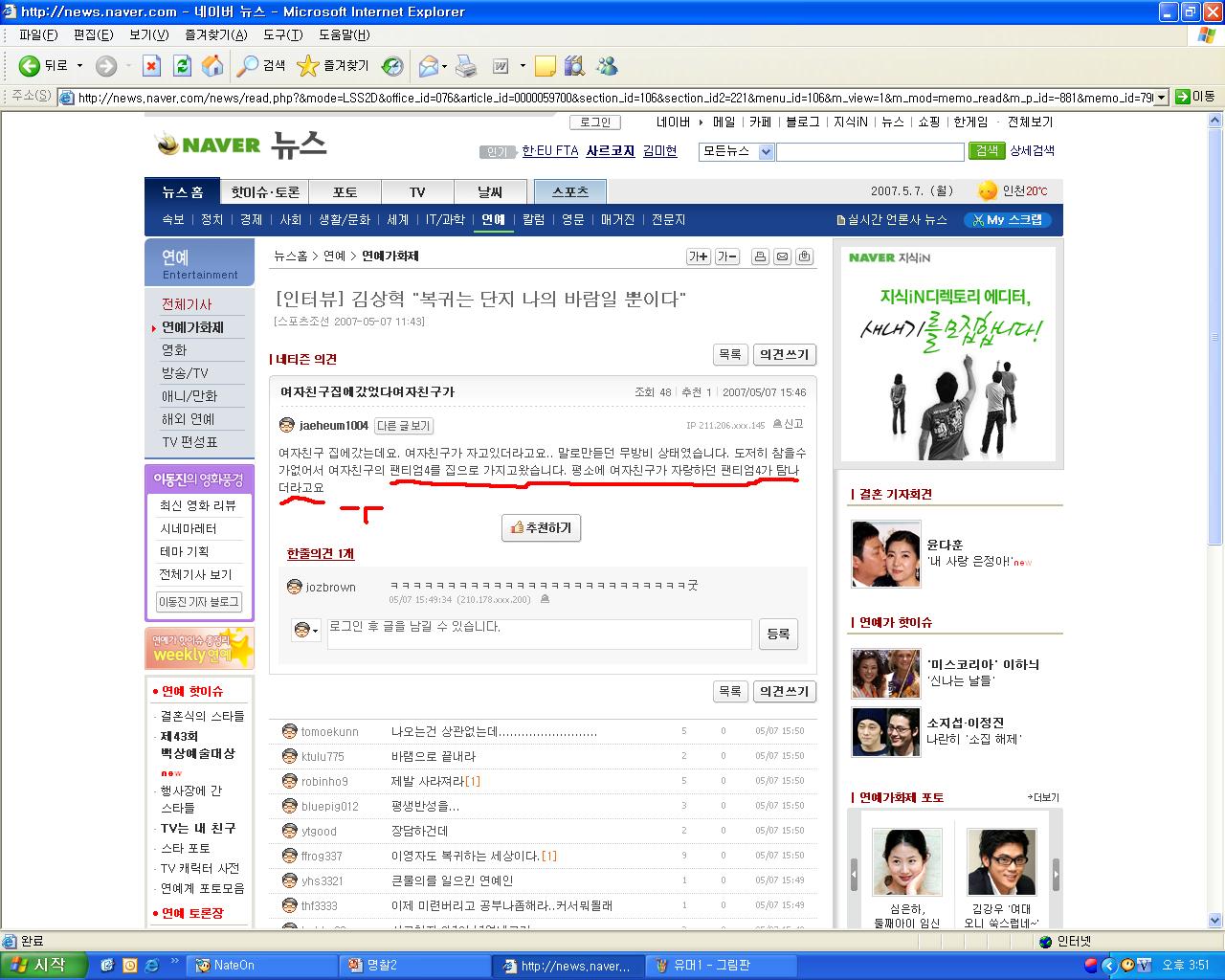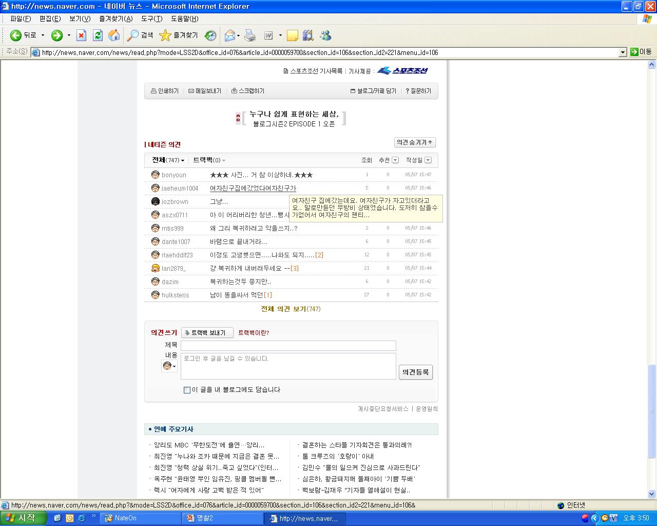 | 456 | '손에 손잡고'를 보고 유투브에 올라온 댓글들 | Dreamy | 2007.09.15 | 7861 | 59 |