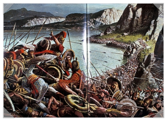 → 스파르타군은 밀집대형을 이루고 청동 방패로 화살을 막았습니다.